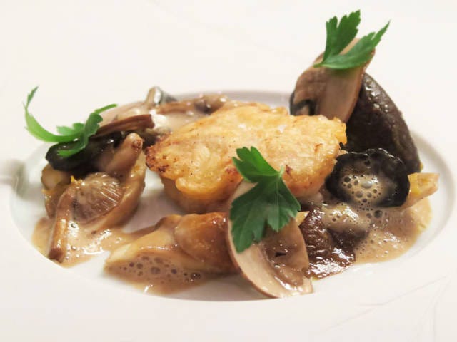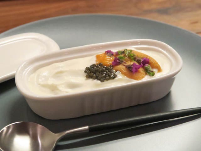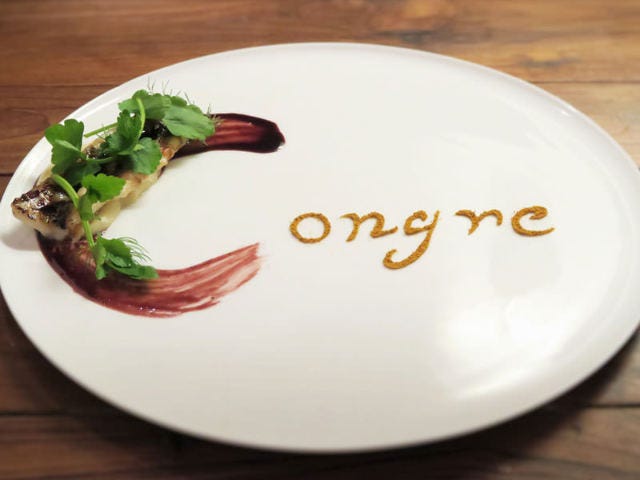 たとえば、季節の食材を使ったシェフおまかせコース(8,800円)では、最初にでてくる料理がなんと小さな缶詰だ。驚くなかれ、それは缶詰の形をした小さな陶器で、蓋を開けると中からアミューズブーシュが現れる。米ナス・信州サーモンのタルタル・心地良い酸味のクレームエペスが緻密に層をなし、その上に雲丹・キャビア・穂紫蘇が飾られた一品。小さなスプーンですくって一口、すべての食材の塩味・甘味・苦味・うま味・酸味が一体となって口内を支配し、食べ手の心を刺激する。見た目の可愛らしさだけではなく、その小さな缶詰の中にきちんと構成された料理としての完成度も高い。そして、兵庫県室津産の牡蠣のグラタンが岩塩の上で炎を上げたり、長崎県対馬の穴子を使った一皿では、穴子が一つのアルファベットとなって皿の上にCongre(フランス語で穴子)の文字が描かれていたりと、ちょっとした仕掛けなのだが、いちいち楽しませてくれる。