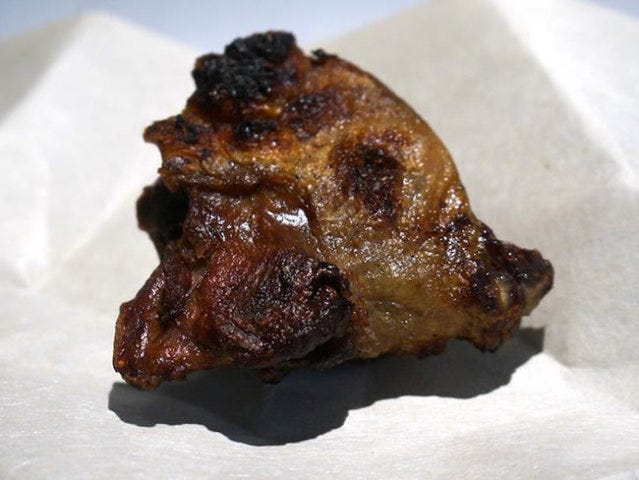レストランなのだが、もう箸もフォークも使ってられんとばかり、一同手で持って齧りつき、脇目も振らずにしゃぶって、骨だけを唇から抜き出して、皿に置くのであった。