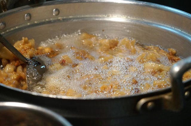 炊きが甘いとトンカツを入れた時に泡が出すぎて溢れそうになり、炊きすぎると焦げそうになる。