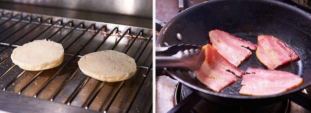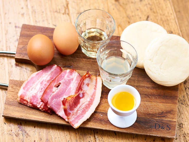 3.イングリッシュマフィンを横半分に切り、トースターでこんがりするまで約1分焼く。ベーコンもカリッとするまでフライパンで焼く。