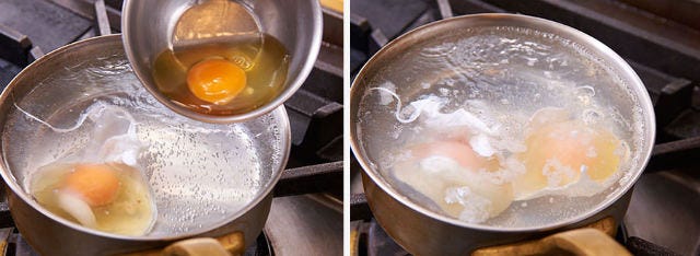 4.鍋に湯を沸かし、酢を入れる。沸騰したら弱火にし、湯を箸でくるくるとかき混ぜて渦を作り、真ん中に卵を時間差でひとつずつ落とす。(慣れるまでは、工程を分けて1つずつ作ったほうが安心)