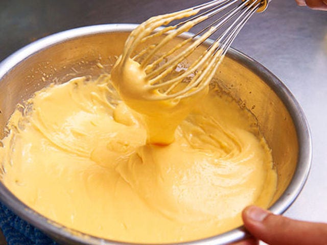 2.卵と分離しないように気をつけながら、溶かしバターの上澄みを少しずつ加え、全体がとろっとしたリボン状になるまで混ぜる。
