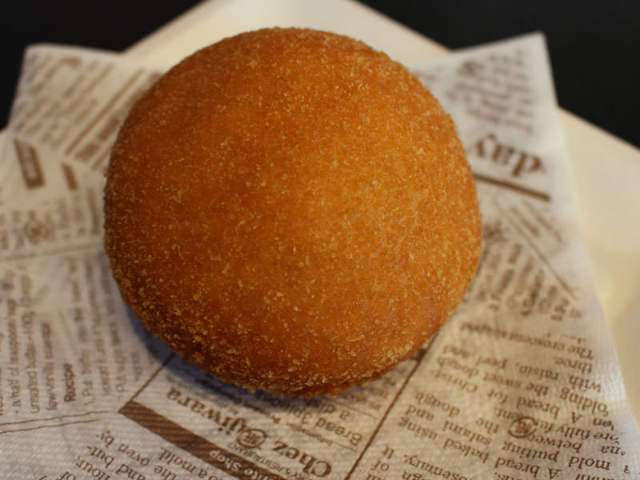 100種類以上のカレーパンの中から5個を選ぶとなると、どれにしようか迷ってしまう。悩んだ挙句、変わりダネをチョイスしてみた。まん丸のフォルムが美しいのは、カレーの名店と呼ばれる「ビストロ喜楽亭」のカレーパン。