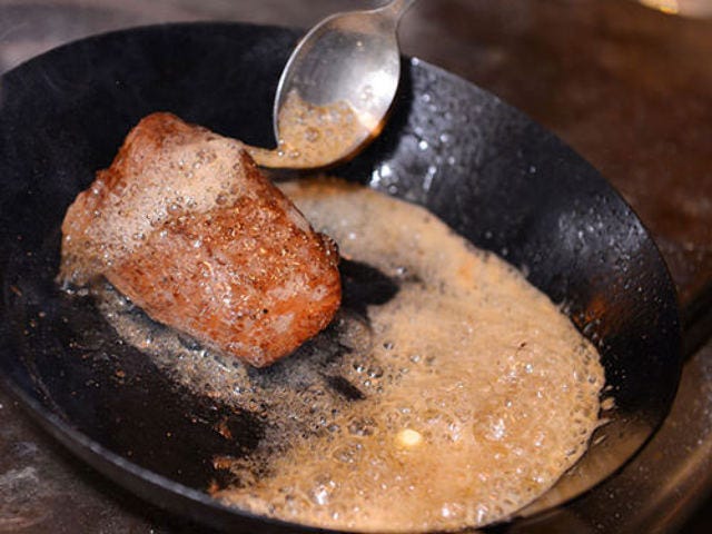 調理過程で出た煮汁や脂を調理中の素材にかけること。今回はバターと肉汁。