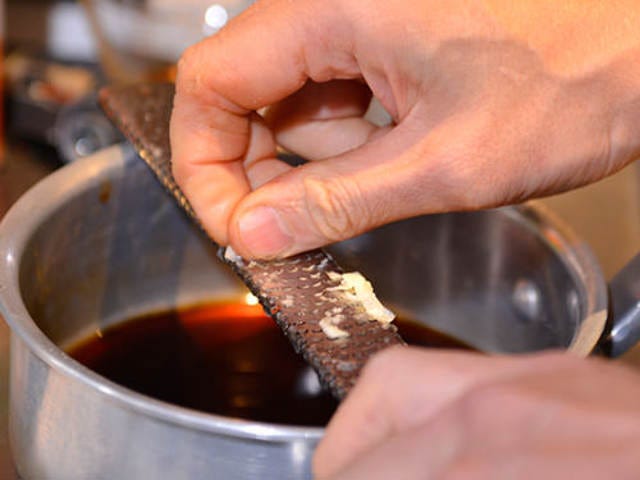 少し煮詰めたらポン酢を入れ火を止める。すりおろしたタマネギとニンニクを入れる。