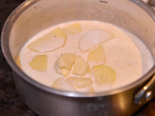 3.そこに牛乳、生クリーム、ニンニクを入れ、余熱した180℃のオーブンで12~13分様子を見ながら焼く。表面に焼色が付き、ジャガイモを串でさしてスッと入るようになったら出来上がり。