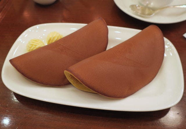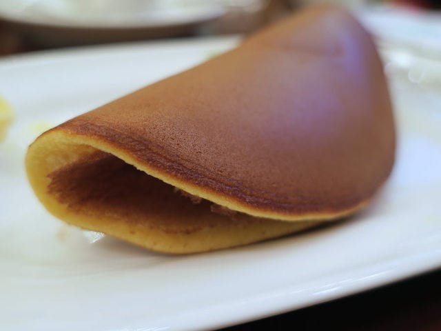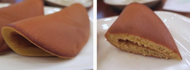 どんなファンシーな食べ物かと思いきや、これが焼きたてのどら焼き(三笠山)の皮なのです。でもどら焼きの皮ですよと云われなければきっと判らないと思います。