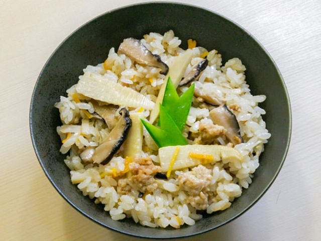 タケノコをはじめ、人参、干し椎茸、油揚げ、ゴボウの香りと旨みがだしとのバランスを演出し、春らしい香りが閉じ込められている。上手に作るポイントは下準備。米を洗ったあと、30分水につけておき、その後50分ザルにあげておく。こうすることで米がふっくらと仕上がり、具材の味を吸い込みやすくなる。
