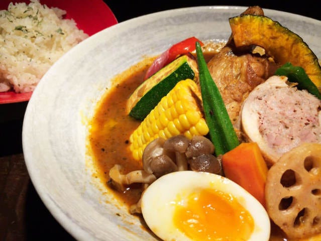 4.肉ダネを詰めた骨付きチキンが主役!緑黄色野菜もたっぷり添えた「スープカレー」