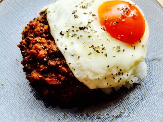 ⑥お皿に熱々のごはんをのせて、カレーをかける。 その上に半熟程度に焼いた卵をのせてバジリコをかけたら完成。