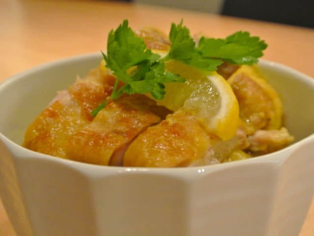 ⑨鶏肉は食べやすい大きさに切る。器にご飯を入れ、出来上がったイエローカリーと鶏肉を盛り付けて完成。お好みでレモンを絞ってどうぞ。