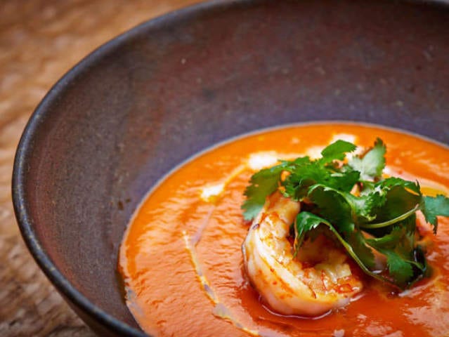 1.野菜の甘みが全体をまろやかにまとめる「赤パプリカと海老のココナッツカレー」