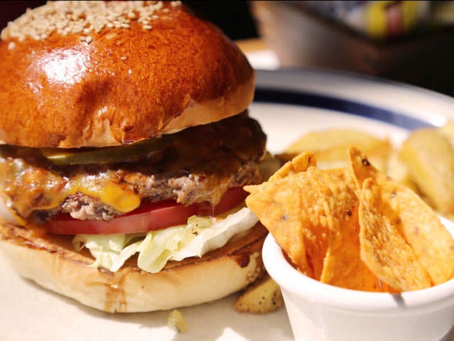 ナチョス風のパリパリ食感とハンバーガーを一度に楽しめる。