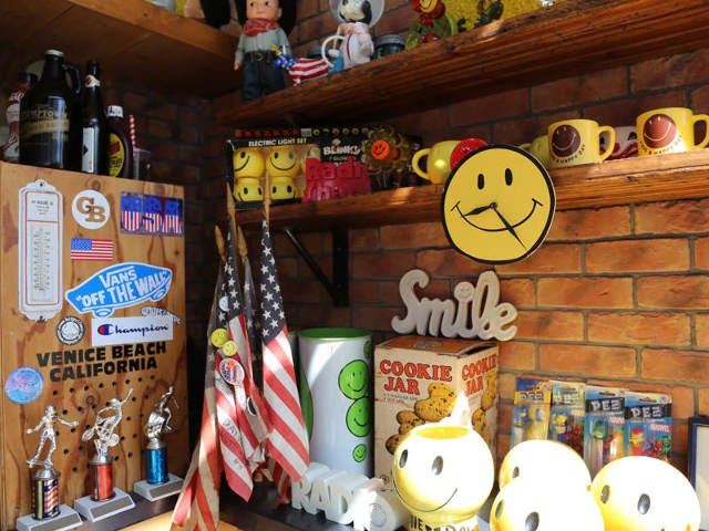 遊び心溢れる雑貨などが店内を飾り、ビンテージな雰囲気たっぷりの西海岸風インテリアが来店客を楽しませてくれる。
