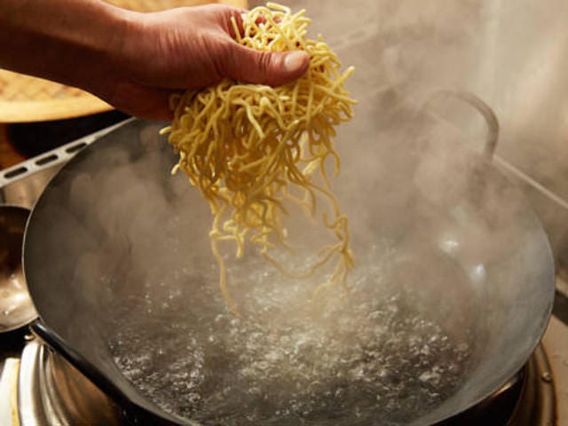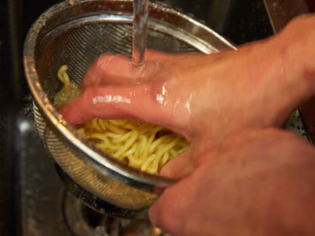 2.茹で上がったら麺に含まれるカンスイを落とすためによく洗う。