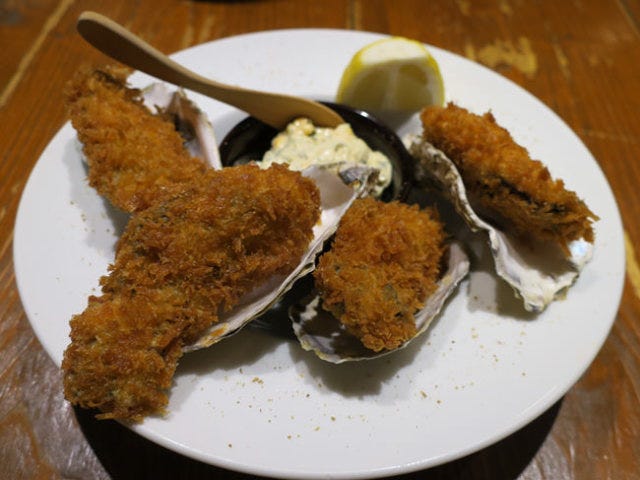 恵比寿『FISH HOUSE OYSTER BAR本店』の牡蠣フライは、フレッシュな牡蠣の魅力が揚げることによってさらに引き出された一品。生で食べる以上に「生」を感じることができる…という表現が適切なのではないだろうか。