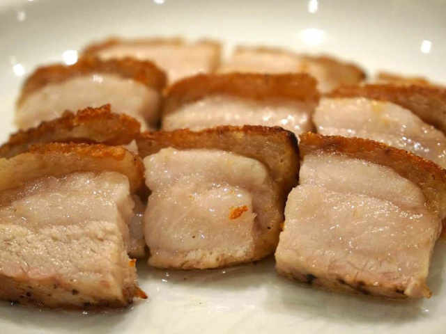 中でも豚の背脂で挟んだレバーの焼物は、脂の甘みとればーのねちっこい甘みが出逢い、ああ中国料理にも色気があるのさと、膝を打つ。