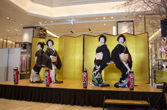 本番公演に先立ち行われた銀座三越のプレイベントでは、そろいの衣裳を身に纏った芸者衆4人が踊り手として登場し、銀座三越1階ロビーの特設ステージで踊りを披露。(銀座三越でのプレイベントは、終了しております)