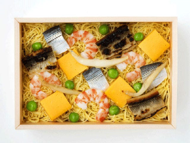 六料亭に加えて、ふぐ料亭wanofuも共同で手がけた「鮨折」2,000円も、煮炊きした具を混ぜ入詰めとなっており、贅を尽くした一品となっている。