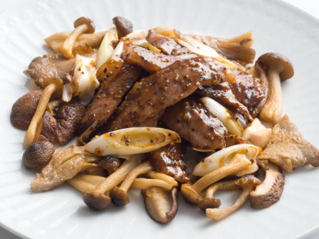 お店の味に近づけるポイントは、牛肉をスライスする前に塊のまま表面を強火でしっかりと焼いておくこと。そうすることで、旨みを閉じ込めることができる。また、少なめのソースで炒めることで、肉本来の味と黒胡椒の味が際立つ。