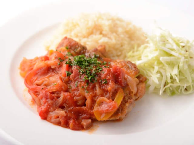 バターライスと一緒にいただけば、トマトソースの甘酸っぱい味わいのあとにバターの風味が口の中いっぱいに心地よく広がる。