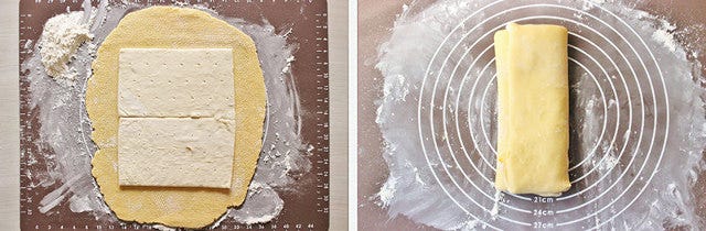 ③ (2)を麺棒でパイシートよりも一回り大きく伸ばし、中央にパイシートをのせる。