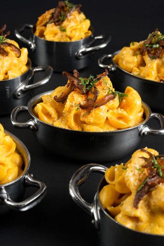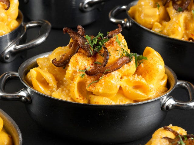 マカロニ&チーズは、スイートポテトとカシューナッツでつくったチーズ風ソースがかかっている。