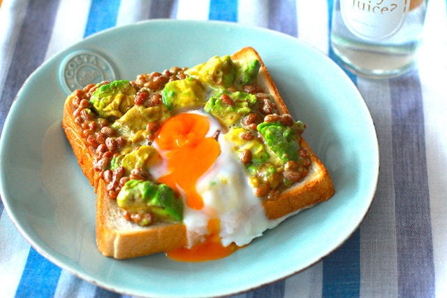 アボカドのとろける味わいと納豆のネバネバが抜群にマッチ。トーストだけでは栄養の偏りが心配という方も、このレシピであればビタミン、タンパク質をバランス良く摂れるのでおすすめ。あとからくるワサビのピリッとした辛みのおかげで、飽きがこず最後までペロリと食べることができる。