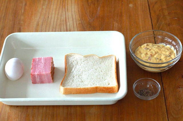 ③食パンにカルボナーラソース1/2量をぬり、厚切りベーコンを散らす。160度のトースターで5分加熱する。