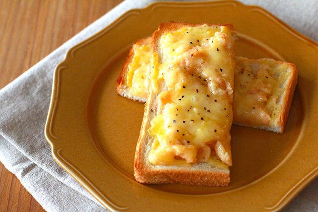 ②食パンに①をのせ、シュレッドチーズをかけたら160℃のトースターで7分焼く。