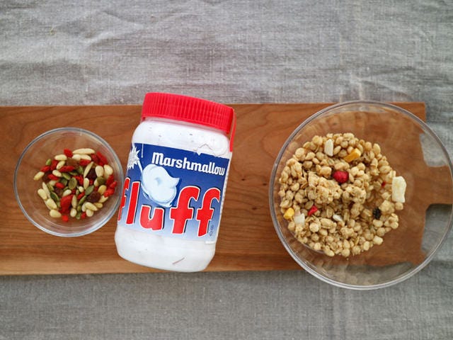 ① ボウルにマシュマロクリームを入れ、シリアルグラノーラ、ナッツを混ぜ、600Wのレンジで30秒間加熱する。