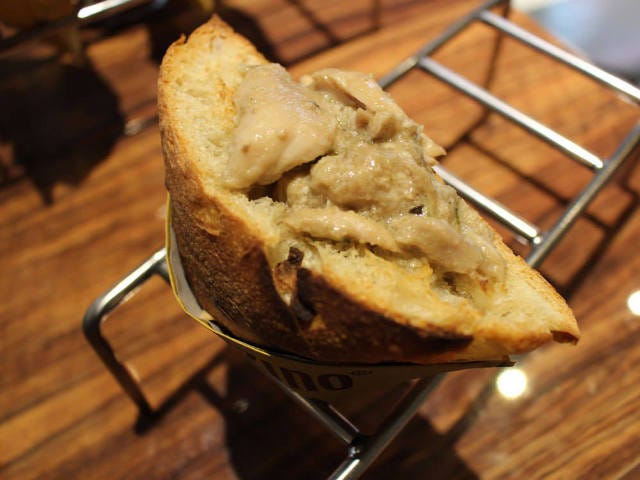 生地は、イタリアから直輸入した小麦粉と天然酵母を使用し、注文が入ってからオーブンで2度焼きするので、外はカリッ、中はモチっとした食感になっている。かぶりついたときに「カリカリ」と音が響くのが心地よく、生地だけでも食べたいぐらいだ。ローマで数カ月にわたり、本店のシェフのもとで修行した料理人が、生地を作っているという。生地も具材もすべて無添加で、具材はレギュラー5種と、日替わりが2種の計7種類から選べる。