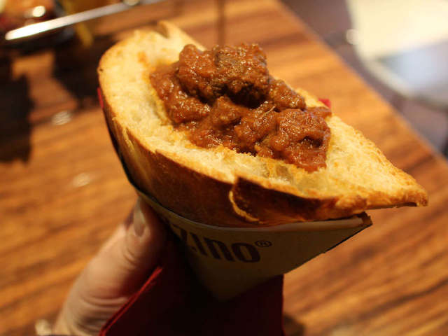 この日の日替わりメニューは「牛肉のズィギ二」。アフリカがイタリアの植民地の時に伝わったとされる牛肉のスパイシーな煮込み料理で、牛肉を“ベルベレ”という唐辛子などの香辛料でもみ、トマト、玉ネギと一緒に煮込んである。じっくりと煮込まれて、柔らかくなった牛肉は、あとからピリっとしたほどよい辛みがやってくる。イタリアでは、これを「激辛」に分類するほどの辛さだそうだ。