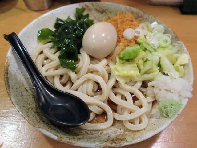 温かいうどんか冷たいうどんを選び、トッピングをまた選ぶと云うシステム。亀有なんてそうそう来たことがありません。せっかく来たのですから温かいのも冷たいのも両方お願いします。麺の量は減らすことも増やすことも可能。基本は300g。減らすとワカメをサービスしてくれます。