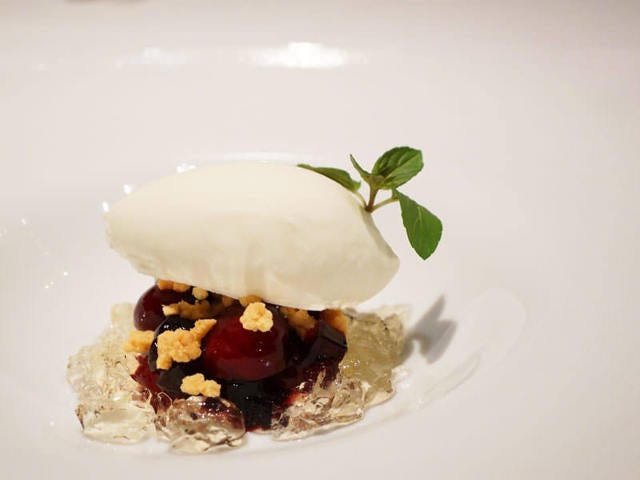 ディナーの最後は「ダークチェリーとKisvin Blancのゼリー ヨーグルトアイス添え」。ヨーグルト味のシャーベットはしっとり滑らかで、スーっと溶けていく。キラキラと揺れる見た目が美しいゼリーは、Kisvinの白ワインで作られており、多品種のブドウを使ってできたワインを使うことで、マスカットの香りと甘み豊かに仕上がっている。サクランボとベリーの甘酸っぱさが、ブランの酸味を閉じ込めたゼリーと調和し、初夏にぴったりの味わいだ。