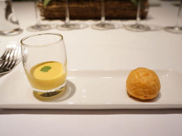 まず、アミューズブーシュとして登場したのが「サーモンのグジェールとパプリカのピューレ」。グジェールと呼ばれるチーズ風味のシュー皮の中に、香草でマリネしたサーモンがはいっていて食感の違いが楽しく、パプリカのピューレがさっぱりとしていて優しい味。