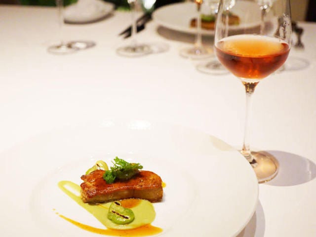この皿には「Kisvin Rose 2014」が提供された。グラスに注がれた輝くコーラルピンク色は、女性なら誰もが高揚してしまいそうな美しい色味。スモーキーな樽香の後にローズやベリーの果実味がほんのり香る。ピノ・ノワール種が主体でシラーやメルローも入っているから、見た目の可憐さとは裏腹に力強く料理をしっかり支えてくれる。とろりとした舌触りと料理の食感も相性がよい。「ソテーされたフォワグラとグリルされたソラマメに、樽香の効いたロゼ。すべて芳ばしいから合うんです」そう話してくれた河合シェフの言葉通りに、香り高いマリアージュ(結婚)が堪能できる。