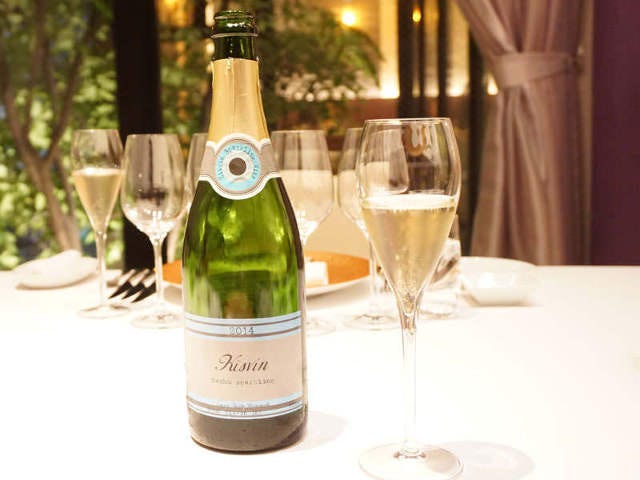 合わせていただいたのが、スパークリングワイン「Kisvin Sparkling 2014」。ほんのり香る熟成香に誘われて口にふくむと、華やかな果実の味が元気よく弾けた。甲州ブドウ100パーセントでフルーティーだがすっきりとしており、何にでも相性がよい。荻原さんによると「本来、甲州ブドウは育てていくと薄紫色になりますが、あえて緑色の状態を保ちながら糖度を22度まであげます。そうすることで醸造時に糖分添加せず、ピュアで深みのある甲州ワインになるのです」と言う。日本のブドウ品種のイメージをよい意味で覆してくれた味の厚みは、荻原さんならではの育て方にありそうだ。世界レベルのシェフやソムリエが好んで飲むのも納得の一杯。次のワインに期待が膨らんだ。