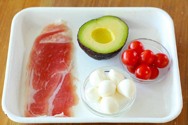 ② ピンにミニトマト、キャンディモッツァレラ、生ハム、アボカドの順に刺す。