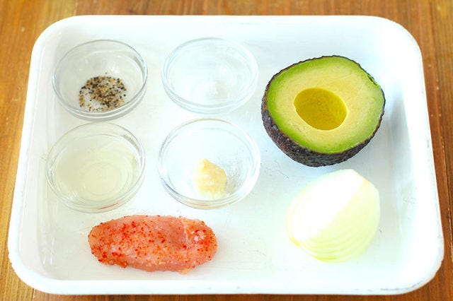 ① アボカドは皮をむき、種を取りつぶす。タマネギはみじん切りにする。明太子は皮から出し、飾り用に少量とっておく。