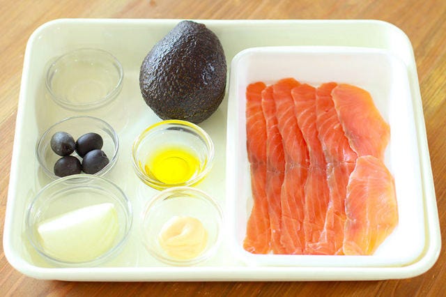 ② <A>とスモークサーモン、 タマネギ、オリーブをボウルに入れよく混ぜ合わせる。