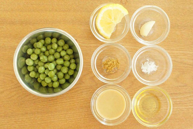 つぶつぶ食感が楽しく、鮮やかな緑色が目にも美しいグリンピースのフムスが完成!