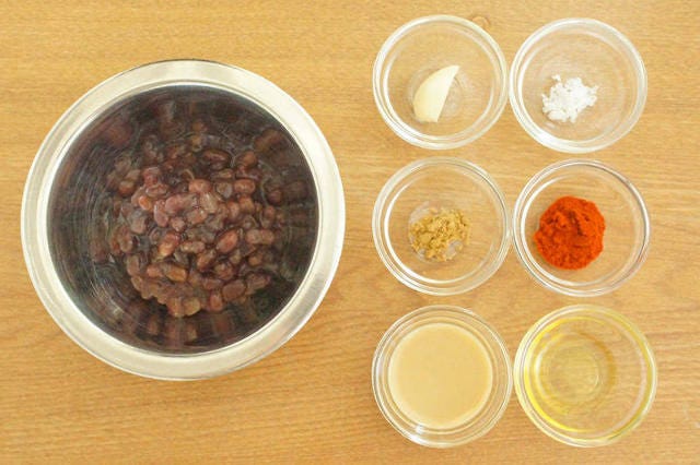 小豆本来の甘さの中に、ニンニクやスパイスの風味が効いたオリエンタルな病みつきフムスが完成!