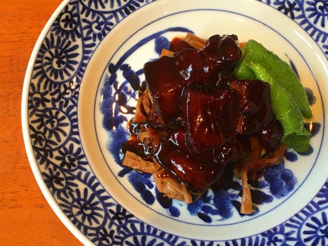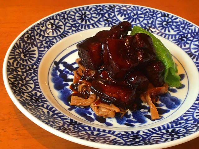 何より肉がおいしい! 皮はカリッとしていて、少なめの脂は甘みがあるのになぜかさっぱりしている。この味を出すために皮付きのバラ肉を輸入しているそうだ。こってりとした醤油煮込みにもってこいの肉である。現地の台所で見て聞いて学んだことを忠実に再現しており、小さい鍋で3 時間、強火で沸騰させつつ圧をかけずに、水、紹興酒、醤油で煮込む調理法は家庭料理そのものである。とろんとした脂が主役の和食の角煮とは真逆で、肉そのものの味がおいしさの鍵を握る。
