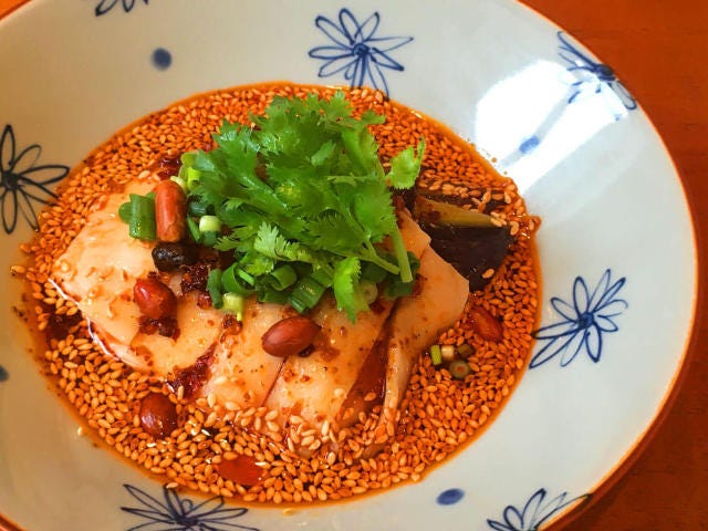 その「よだれ鶏」をつけて食べる「餃子」もかなり進化を遂げた。特筆すべきは餡と焼き方。肉が多めの餡の中には豚の皮からとったスープで作った煮こごりをまぜる。餡はもっちもちの自家製の皮に包まれ、まずは蒸す。そして油たっぷりの鉄鍋で“揚げ焼き”にする。食べた瞬間、小籠包並みの肉汁が溢れ出すので要注意だ。正直、そのままでも十分おいしいのだが、せっかくなので「よだれ鶏」のタレに黒酢を入れてみる…、これは2倍ではない! 10倍増しである! ぜひお試しあれ!