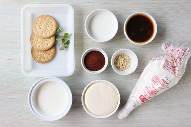 ① グラスにAを入れ、ビスケットをふやかしておく。