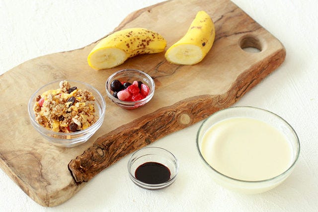 ③ グラスに2/3量のグラノーラを入れてバナナを貼り、①を注ぐ。