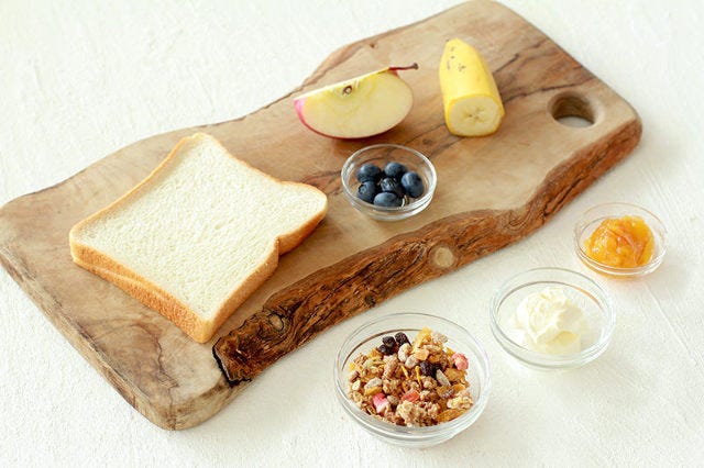 ③ 食パンに②を塗り、りんご、バナナ、ブルーベリーをのせる。