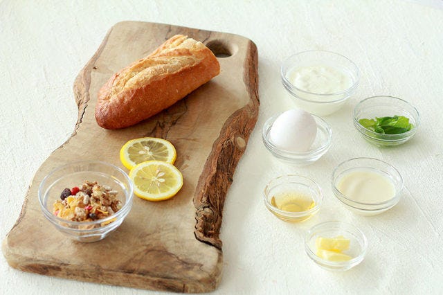 ハチミツを加えて自然な甘さを出したヨーグルトにグラノーラを加えたリッチなソースがポイントのフレンチトースト。お好みのタイミングでレモンをギュッと絞り、ミントをちぎって散らすと爽やかな酸味と香りが加わり、味わいが変化してまた違ったおいしさを楽しめる。