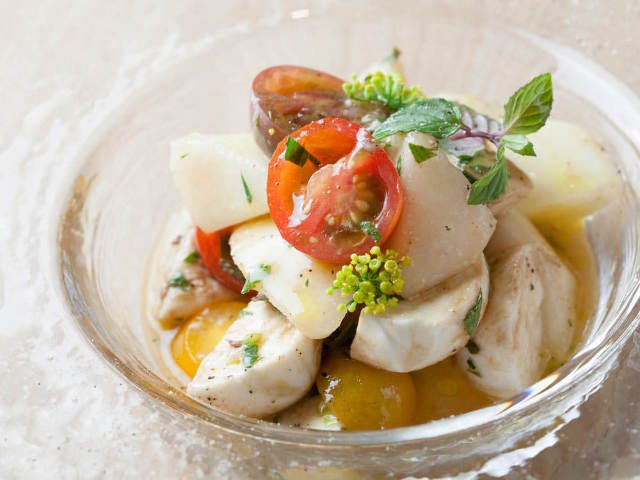 さて、こちらの日本酒と料理のペアリングはどんなものなのかを紹介していこう。まずは「桃と水牛とモッツァレラのサラダ」。定番のこのメニューは季節によってフルーツが変わる。